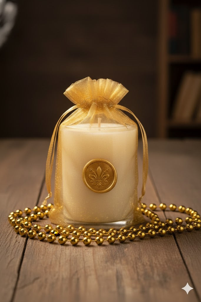 Each candle is hand-poured into our recycled 8.25 oz glass tumbler and stamped with a hand-pressed wax seal bearing the fleur de lis—the iconic mark of our city. It arrives slipped into a colorful organza gift bag, ready for immediate gifting or hosting duties.